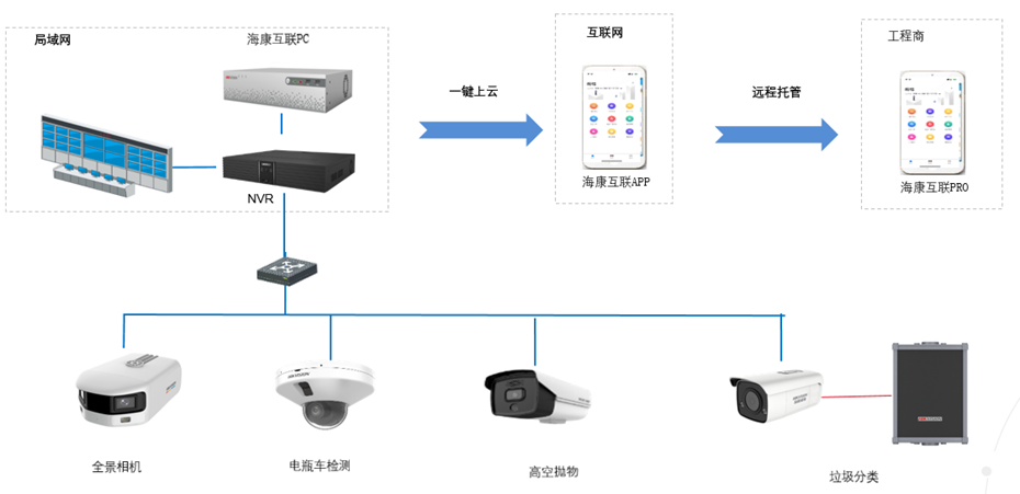 采用云边协同建设思路,在边缘侧,通过海康互联一体机内置海康互联综合平台,打造软硬一体边缘接入硬件,高性价比,满足本地视频预览、回放、上墙的需求。通过一体机联网,一键上云,实现手机app、远程客户端远程预览、回放需求。小区告警消息,如高空抛物、车位违停,实时推送手机端与客户端,并支持后端与摄像头对讲,提升管理效率。