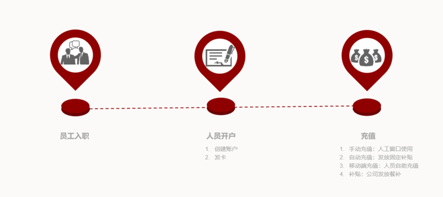 新员工入职后,可对人员进行开户、发卡,人员在后续的使用中,可以通过窗口进行人工充值、或者是在移动端进行自助充值,也可以通过公司向个人账户发放固定补贴