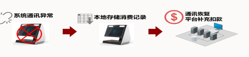 系统离线记账模式下运作时,消费者可正常刷脸就餐,系统通讯恢复正常后进行账户扣款,当账户余额少于透支额度(没有设置则默认为0元)时,则不允许再次消费