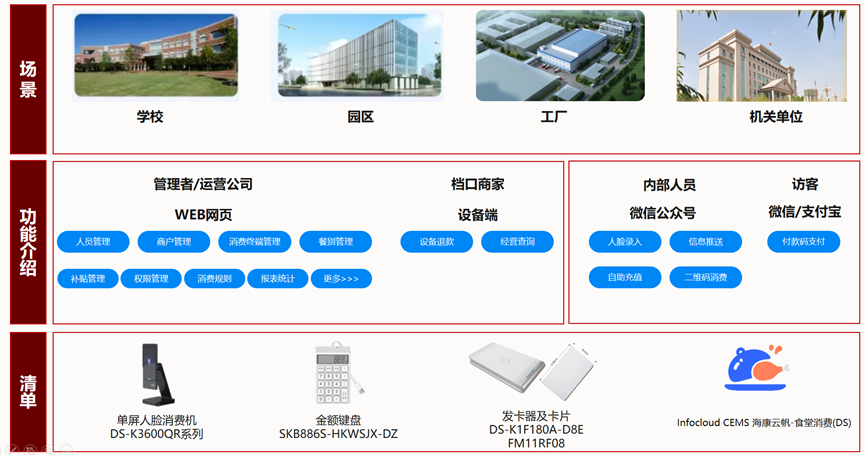 面向工厂园区、学校、机关单位的食堂消费项目,在以轻量化建设为核心诉求的场景中,通过互联网接入消费终端,并提供消费人员管理、食堂商户管理、餐别管理、消费规则管理、统计报表管理等功能,提供消费者便捷的就餐体验,帮助食堂管理方提升管理效率。