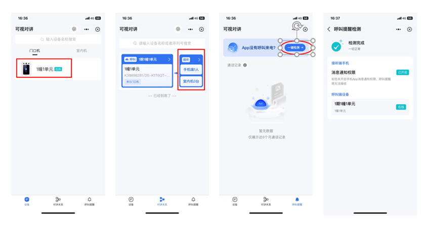 ⑥可视对讲:管理员进入“可视对讲”可查看已配置通行权限的各单元门口机设备,在“对讲关系”中可查看对应的可呼叫人员及室内机设备。业主可在“呼叫提醒”中一键检测手机消息通知权限是否开启,避免系统拦截云对讲呼叫。