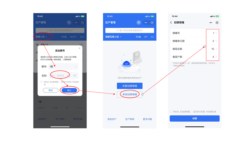 ②创建楼宇:管理员在“住户管理”中按照项目实际情况,添加期号创建小区、楼幢、单元。