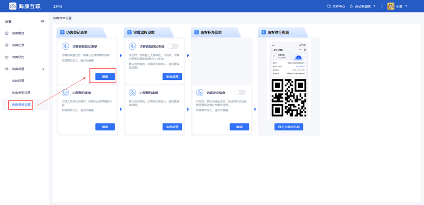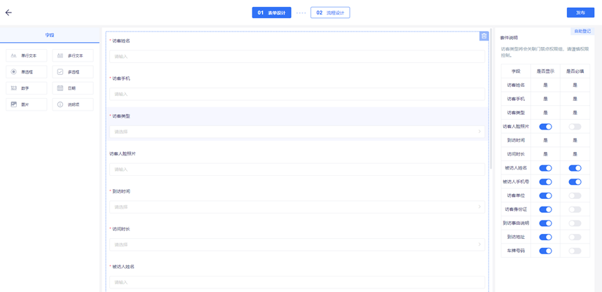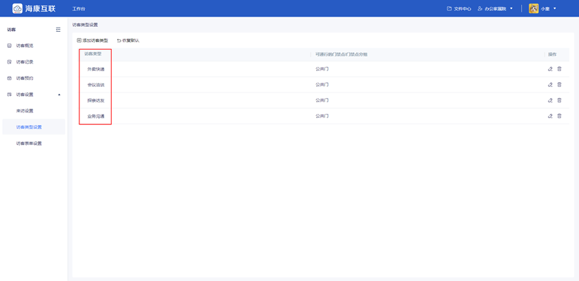 管理员可设置访客类型及对应的通行的门禁点,访客表单也可自定义修改。