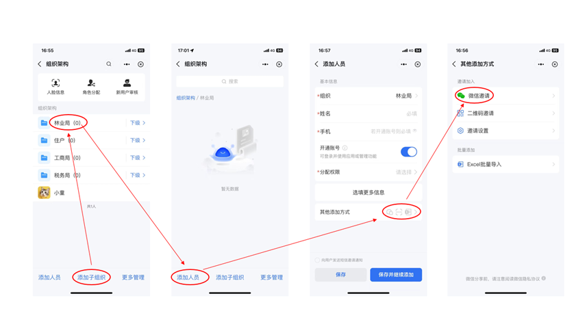 工作人员录入:管理员在“人员管理”中,根据办公机构情况分别创建对应的组织如“林业局”,进入后选择“添加人员-其他添加方式”,可使用"微信邀请"功能转发至办公群,工作人员通过点击链接可快速加入对应组织。