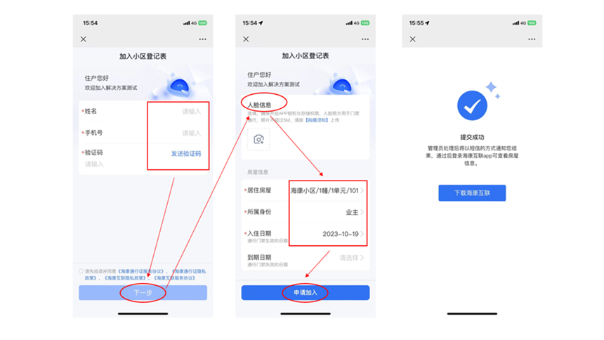 业主可使用微信扫码校验手机号码正确后,可自助录入人脸信息,选择对应的房间号申请加入,待物业审核通过后加入团队。