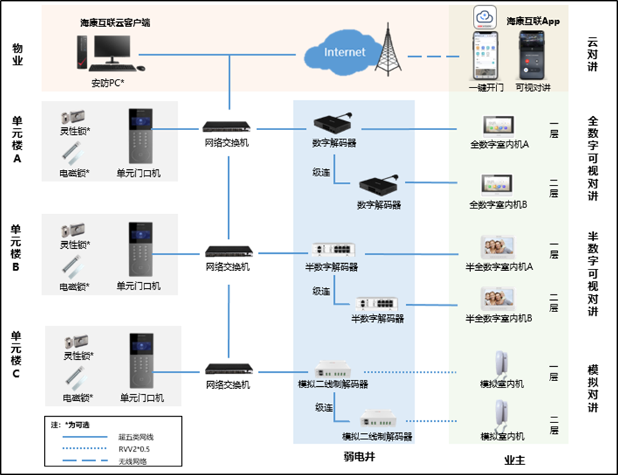 每层弱电井部署半数字解码器通过网线连接各户半数字室内机,各层半数字解码器手牵手级联,并与单元门口机通过网线连接,住户在家接听可视对讲和一键开门,可能需要入户墙面开孔布线,设备成本低于全数字可视对讲。
