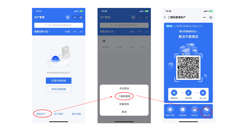 ③内部住户录入:管理员在“住户管理-添加住户”中,可选择“二维码邀请”,将业主登记二维码转发至业主微信群,方便业主自助扫码申请登记。