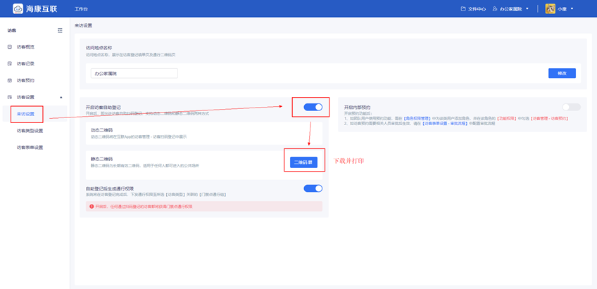 ⑤访客管理:管理员登录海康互联web端,进入“访客-访客设置-来访设置”开启访客自助登记功能,并下载静态二维码打印张贴至出入口,访客可通过微信扫码二维码,填写个人信息及到访目的后生成通行二维码,使用通行二维码即可通过大门。
