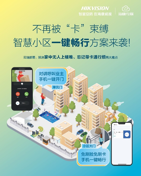 一键畅行:使用海康威视人脸门口机,业主可以选择 刷脸或刷卡(个人信息敏感业主)方式自由通行;若忘记带卡可选择海康互联App“一键开门”快速通行。