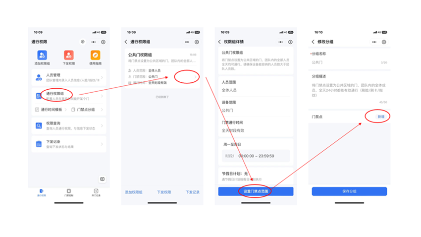 ④通行权限:管理员需要创建小区大门(公共门)权限组和各单元权限组,实现业主通行小区大门及自家楼幢单元门。